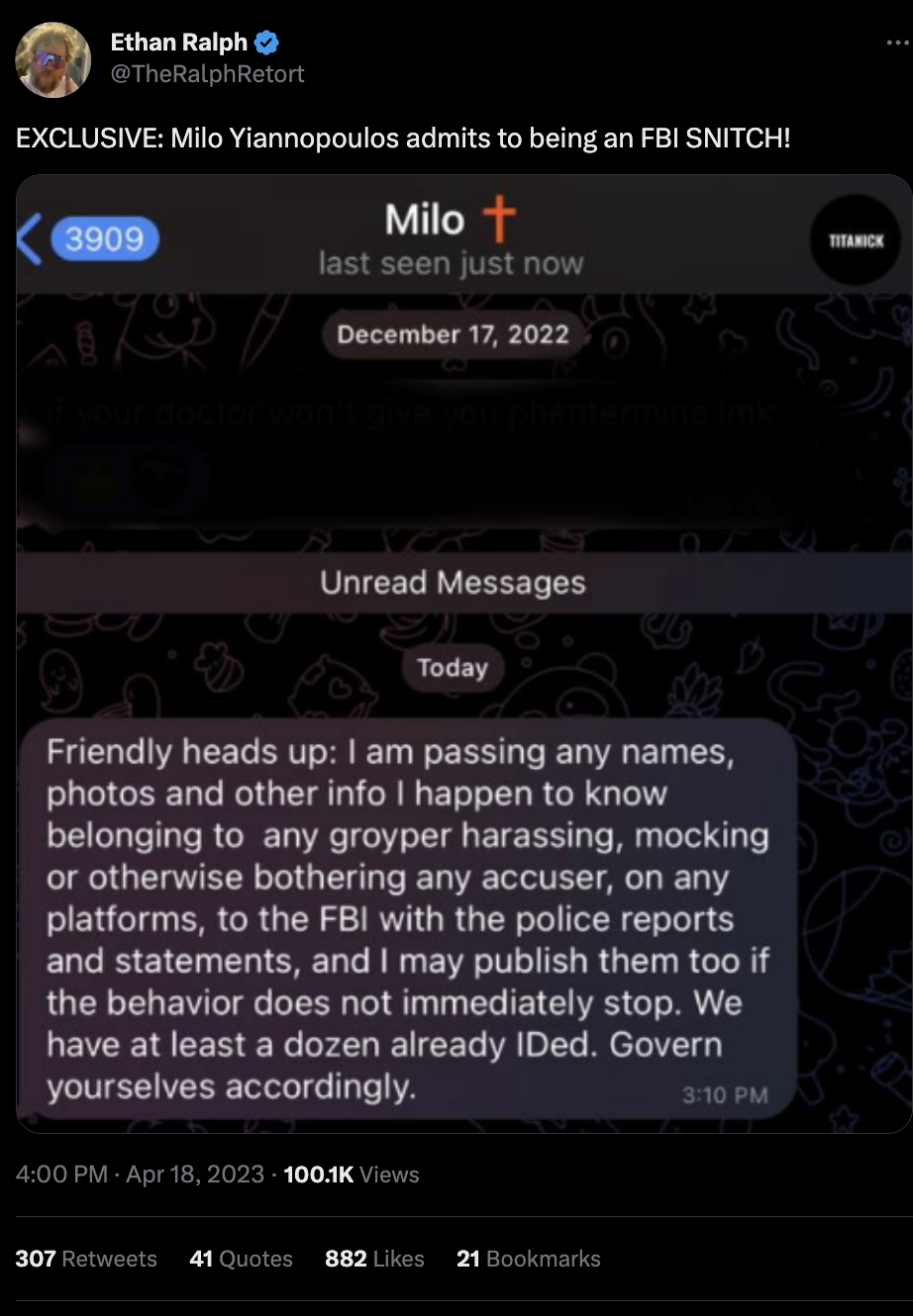 In April of this year, in a text message revealed by Ethan Ralph (the authenticity of which has not been denied), MILO stated that he was working with the FBI to hunt down and destroy anyone who insults him, and is collecting and turning over information to them.