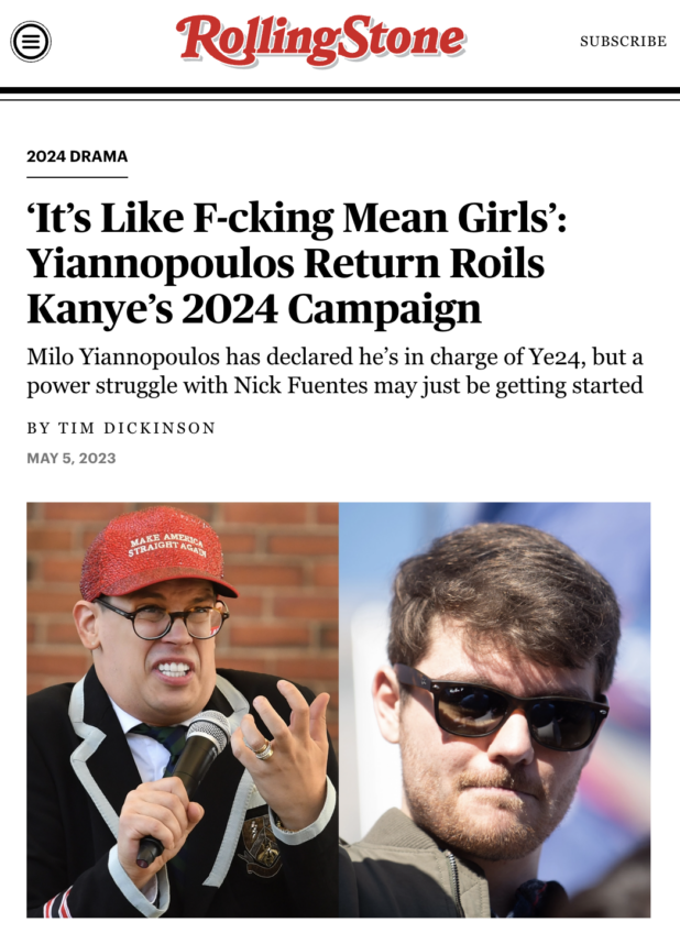 Unfortunately, as things stand right now, insofar as a YE24 campaign still exists, I do not have any interest in it, and I am officially withdrawing my endorsement. It was confirmed earlier this week, through leaked texts and various tabloid news articles, that Nick Fuentes has been sidelined and the dastardly fiend Milo Yiannopoulos AKA “MILO” is now in charge.