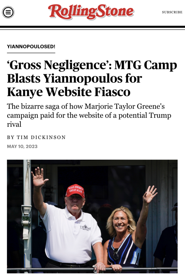 This week, it was revealed in the media that MILO committed an FEC violation by using Marjorie Taylor Greene’s credit card to purchase the YE24.com domain, and then charging Ye again for the domain. (I still don’t understand why Greene would be paying for the domain in the first place, but okay.) This allowed him to steal something like $10,000, which is frankly not very much money.