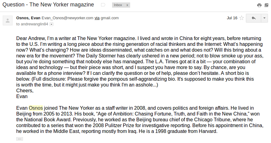 In Jared Taylor’s response to the anti-Trump article, he mentioned that Osnos contacted him under the pretext that he was writing about the Dylann Roof incident.