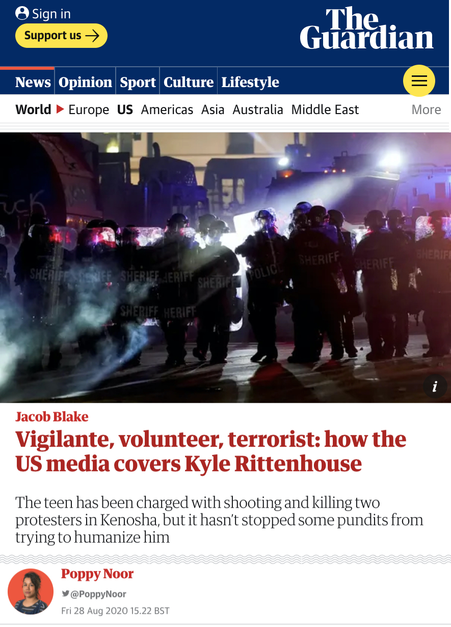 By Friday, the single publication that was printing the word “terrorist” in connection with Kyle Rittenhouse was The Guardian, which ran a babbling brook of an op-ed by one Poppy Noor entitled “Vigilante, volunteer, terrorist: how the US media covers Kyle Rittenhouse.” The article condemned the American right media for “humanizing” Kyle, long after the humanization was complete.