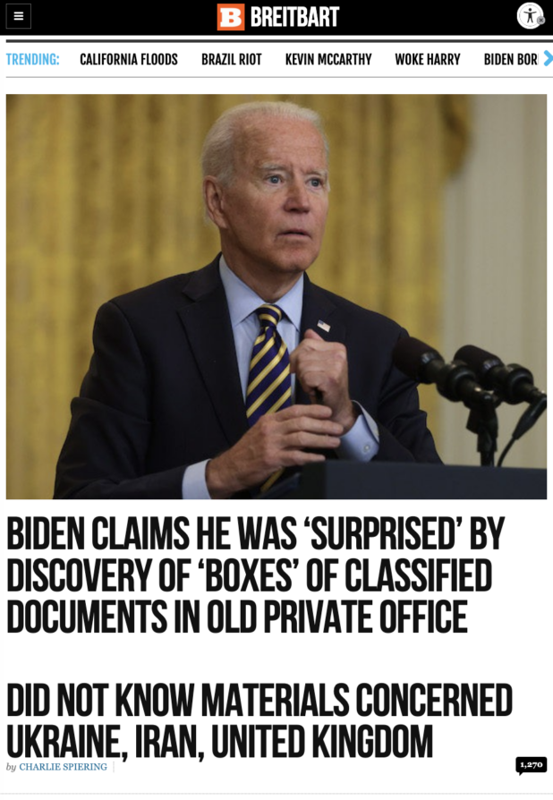 Every major right-wing news site is running the “Joe Biden classified documents scandal” at the top of their pages, and they will be doing this for weeks or years on end.