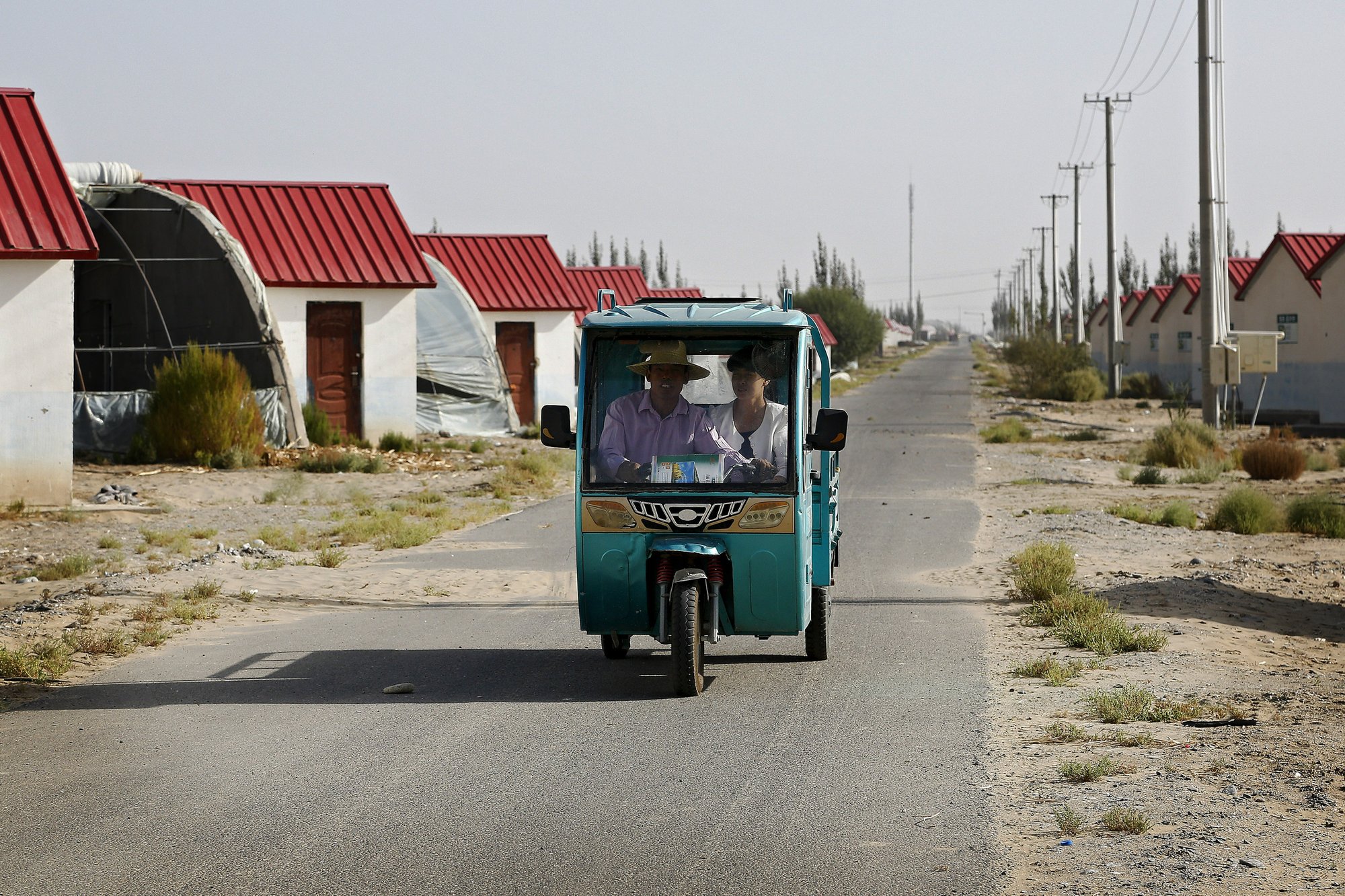 In this corner of China’s far west, rows of identical white concrete houses with red metal roofs rise abruptly above the sand dunes of the harsh Taklamakan Desert. A Chinese flag flutters above the settlement, and a billboard at the entrance says, “Welcome to the Hotan Unity New Village.”