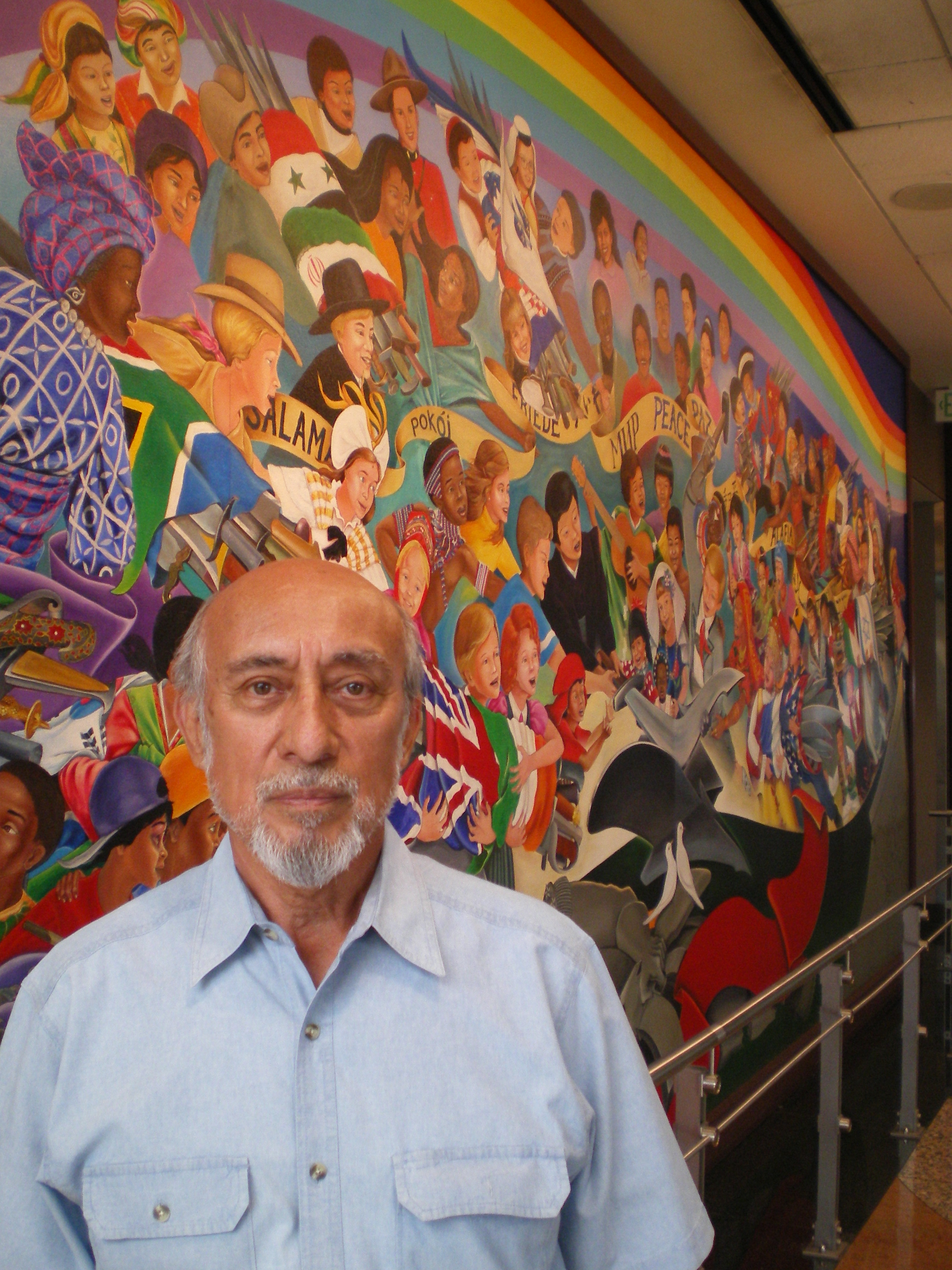 The second part of the mural, the “after,” shows the children of all races in the traditional garb of their respective nations gathered around a plant, living in harmony with nature.
