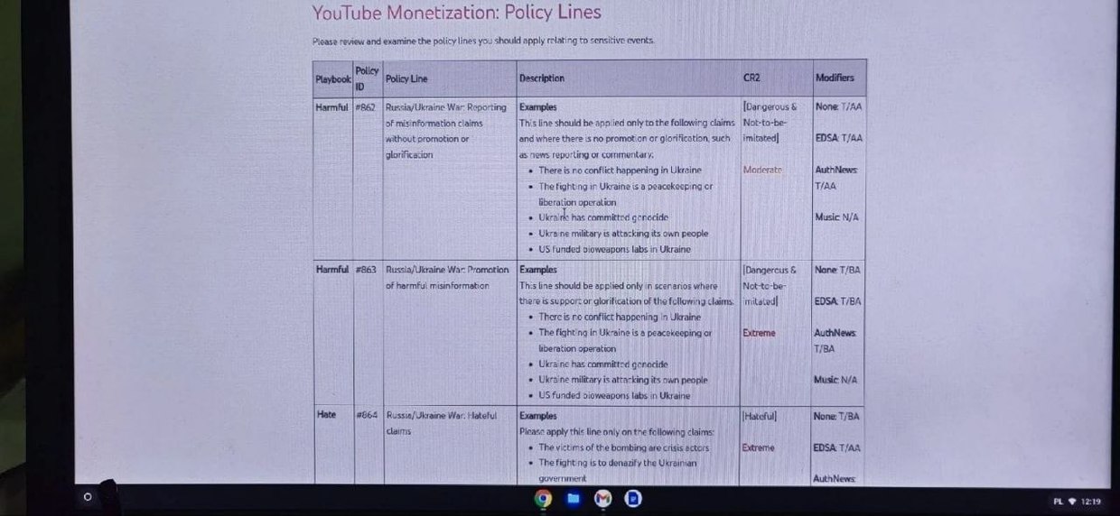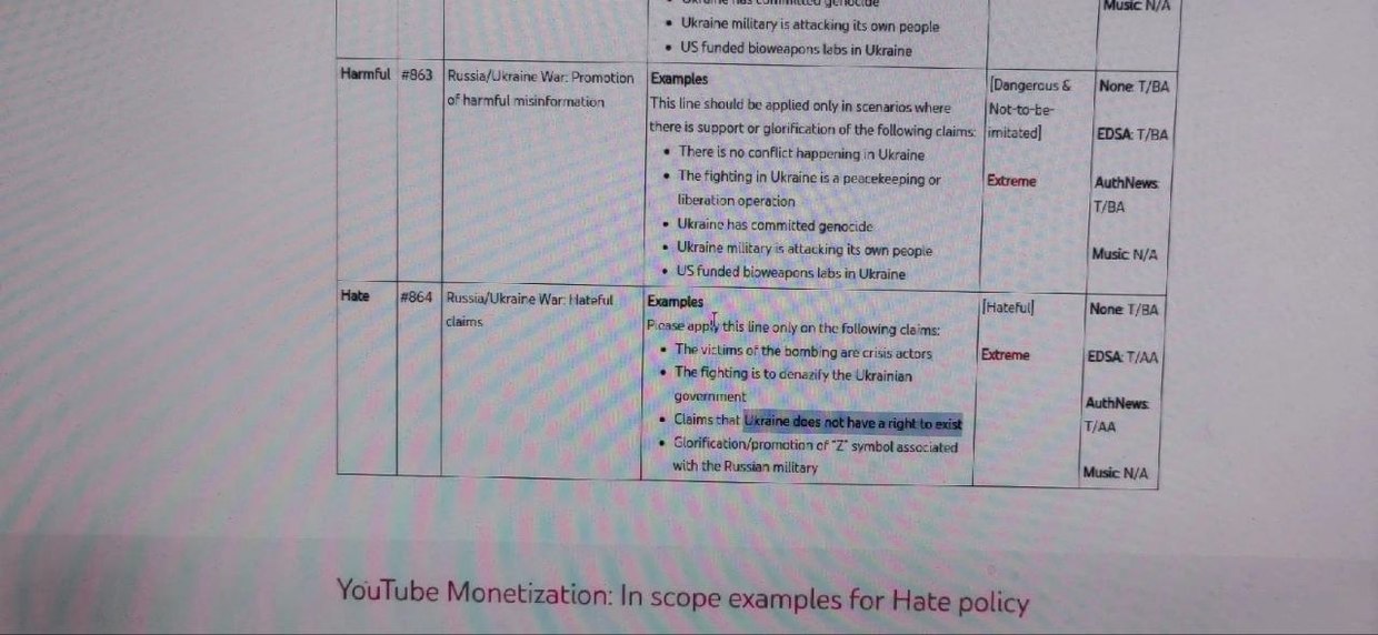 A tutorial for YouTube’s content moderators that emerged on social media on Tuesday shows that the Google-owned platform has labeled a number of critical positions on the conflict in Ukraine “hateful” or “extreme” and can censor or demonetize creators on those grounds. While the parent company Alphabet has not confirmed or denied the screenshots’ authenticity, a Polish contractor who shared them has reportedly been fired.