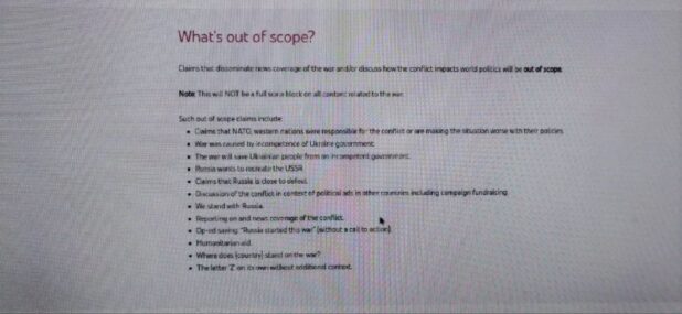 There was no clarification whether either standard would apply to factual reports of Ukrainian artillery targeting Ukrainian citizens living in territories under Russian control, for example.