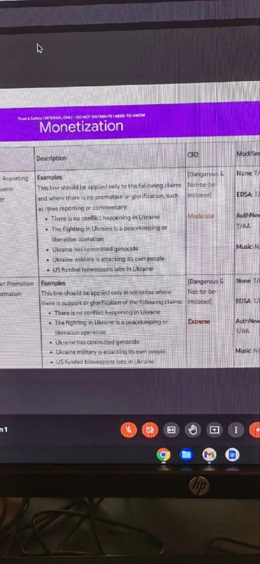 According to the slides, the “glorification/promotion of [the] ‘Z’ symbol associated with the Russian military” is labeled “hate” and “extreme” under policy ID 864. So is saying that the conflict “is to denazify the Ukrainian government,” which is what Russian President Vladimir Putin said in February.