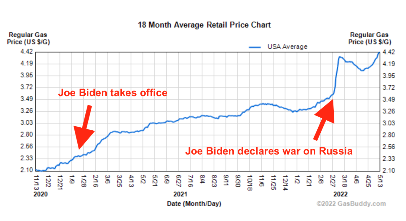 It was $2.40 when Biden took office, 13 months later it was $3.40, then in a few days after Biden started this war it went up to $4.40. They were able to push it back down to around $4 after people started complaining about it, but now it’s going back up, surpassing the high hit after the war declaration.