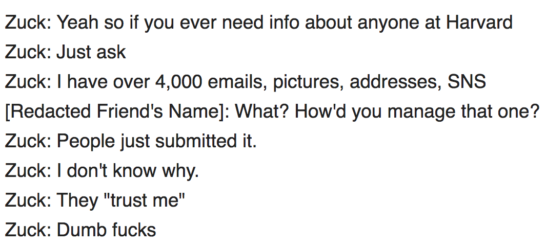 Doesn’t everyone remember that like, when the platform was first launched in 2004, he was on record calling people “dumb fucks” for giving him all their info and offering to give it to someone?